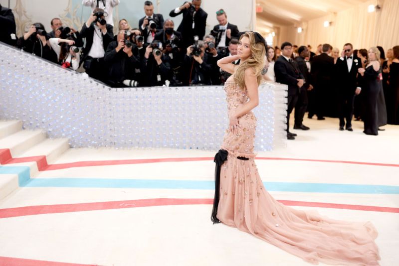 Kim Kardashian steered clear of wearing the world’s most expensive gown – Monroe’s was valued at $US4.6m. Photo: GettyEnglish actress (Don’t Worry Darling) Florence Pugh had a buzz cut and wore a headpiece that honoured Lagerfeld’s extravagant runways, which were often made by Phillip Treacy. Photo: GettyInside Choupette, who is now seriously famous, is US actor Jared Leto (House of Gucci). Photo: GettyEmily in Paris‘ Lily Collins looked tres tres chic and honoured Lagerfeld by writing his name on the train of her Vera Wang gown. Photo: GettyDate night. Yung Miami and Sean ‘Diddy‘ Combs, who got a chance to spend time with Lagerfeld when he was designing his own line, Sean John. Photo: GettyJanelle Monáe (Glass Onion) did one of those Blake Lively-esque gown transformations on the carpet, revealing the conical ensemble. Photo: GettyGlenn Close wearing a distinctive Erdem Moralıoğlu designer gown, accompanied by the man himself to help with the train. Photo: GettyCara Delevingne pays homage to Lagerfeld with silvery blue hair and trademark white shirt. Vogue says she was a close friend and muse, and she admitted she even cried on the way to the party. Photo: GettyLiu Wen and editor-in-chief of Vogue China, Margaret Zhang. Photo: GettySilver spray, silver g-string, silver shoes from rapper Lil Nas X. Photo: GettyJulia Garner (Ozark), Halle Bailey (The Little Mermaid) and Daisy Edgar-Jones (Where the Crawdads Sing) arrived together to celebrate Lagerfeld. Photo: GettySinger Kim Petras, who collaborated with Sam Smith and won a Grammy, is concentrating on walking in platform boots. Photo: GettyModel Ashley Graham teamed up with British designer Harris Reed, who drew inspiration from the 1980s Chanel Haute Couture: “Together, we’ve created a powerful moment blending Lagerfeld’s grace with Harris Reed’s signature fluidity,” wrote Graham on Instagram. Photo: GettyAnne Hathaway (The Devil Wears Prada) in a flowing hair Lagerfeld tribute, and Jared Leto and the cat again. Photo: GettyOscar-winner Jessica Chastain (The Eyes of Tammy Faye) gives a sunglasses nod to Lagerfeld. Photo: GettyNot sisters, but mother and daughter, Wendi Murdoch and Grace Murdoch. Photo: GettyBarbie actress and Chanel ambassador, Margot Robbie. Photo: GettyJenna Ortega’s (Wednesday) goth-inflected look not only nodded to Wednesday Adamms’ style codes with its schoolgirl bow detail at the neck, but also paid homage to a number of the design signatures of Karl Lagerfeld with its black and white palette, gold chains and pearls, says Vogue. Photo: GettyAmerican-English actress Sienna Miller wore Gucci Fall Winter 2023 sleeveless black gown with slit details. Photo: GettyHugh Jackman, with wife Deborra-Lee Furness, is already bulking up and growing a beard for his next Wolverine incarnation in Deadpool 3.Photo: GettyUS-based Australian actress Nicole Kidman, with director Baz Luhrmann, recycling a Custom Chanel gown from a 2004 photo shoot. Photo: GettySydney Sweeney (The White Lotus) in a blush pink Miu Miu gown. Photo: GettyGisele Bündchen in a feathered coat over her white gown, Chanel haute couture spring/summer 2007. Photo: GettySouth Sudanese-Australian model Adut Akech is a firm fixture at the Met, and she floated onto the carpet in Manhattan wearing a spectacular tiered Carolina Herrera gown that honoured a man who transformed her career: Karl Lagerfeld. Photo: GettyTime to sit down and talk about reality – Kim Kardashian, Kendall Jenner, Jared Leto and Kylie Jenner. Photo: GettyFrench fashion designer Olivier Rousteing. Photo: Getty
