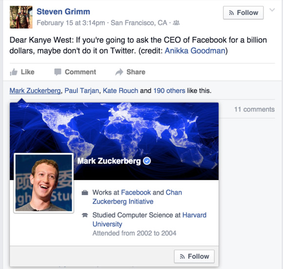 Steven Grimm, a Facebook engineer, posted on the social media site: “Dear Kanye West: If you’re going to ask the CEO of Facebook for a billion dollars, maybe don’t do it on Twitter.”