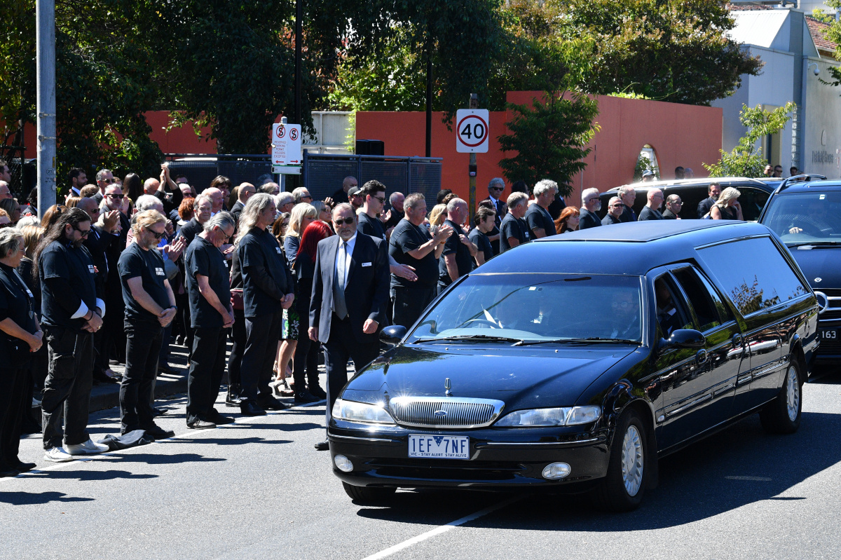 After the private service, more than 160 roadies set up a guard of honour as Mr Gudinski’s hearse left the venue.
