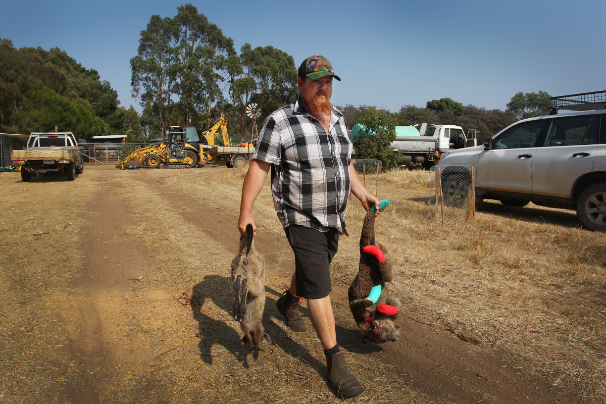 In another, the owner of the Kangaroo Island Wildlife Park carries the bodies of a dead kangaroo, and a koala – its paws bound with colourful bandages – towards a mass grave.