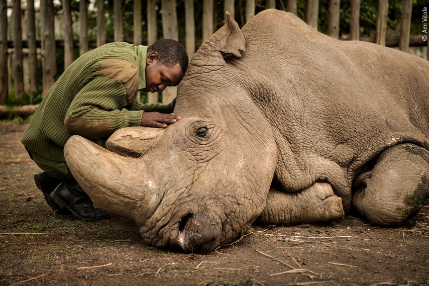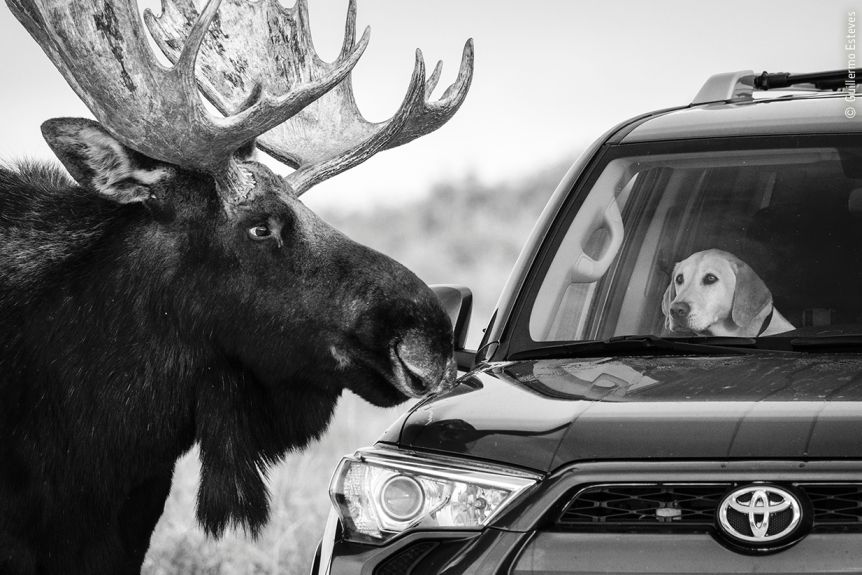 The popular images include Ami Vitale’s heart-warming portrayal of a bond between ranger and rhino and the wonderfully composed wintry portrait from Andy Parkinson (both above); an innovative remote capture of two squirrels from Neil Anderson and a meeting between a worried looking Labrador in a car and an enormous moose, taken by Guillermo Esteves (below).