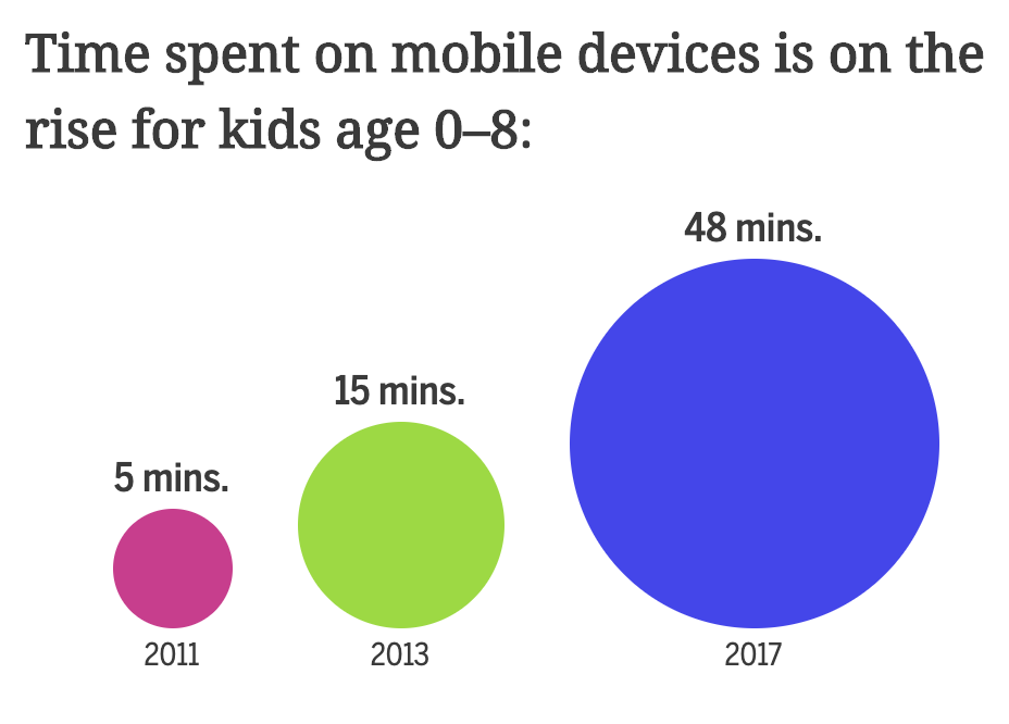 The amount of time young children spent on mobile devices soared from just five minutes in 2011 to 48 minutes in 2017, research by San Francisco-based digital wellbeing not-for-profit Common Sense Media found.