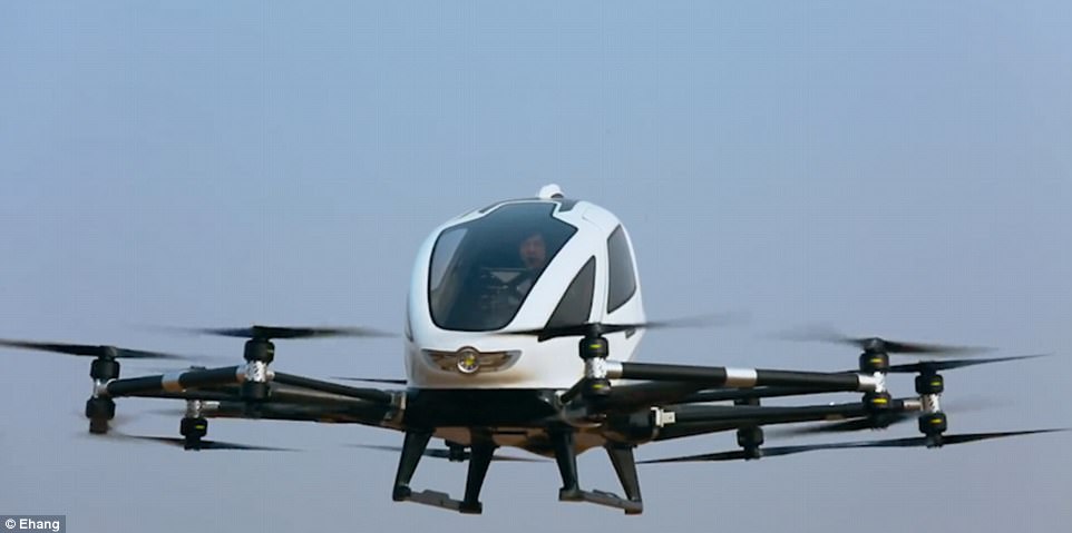 EHang’s EH216-S is equipped with 16 propellers, each with its own motor, and can travel at 100km/h for about 25 minutes, according to the company.