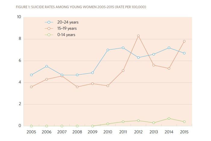 The report highlighted that although suicide rates among young men were still higher than women, female suicide rates had doubled over the past 10 years.
