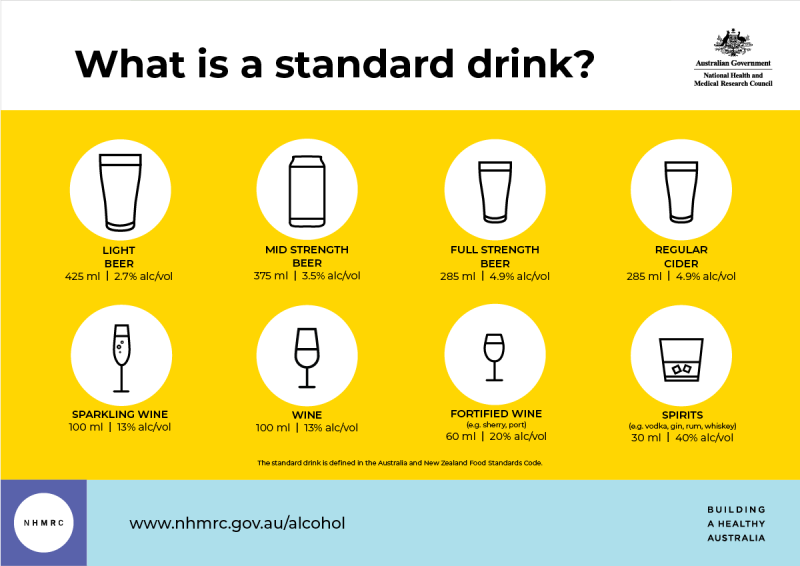 The department advises that, if you’re a healthy adult, to reduce the risk of harm from alcohol-related disease or injury, healthy men and women should drink no more than 10 standard drinks a week and no more than four standard drinks on any one day.