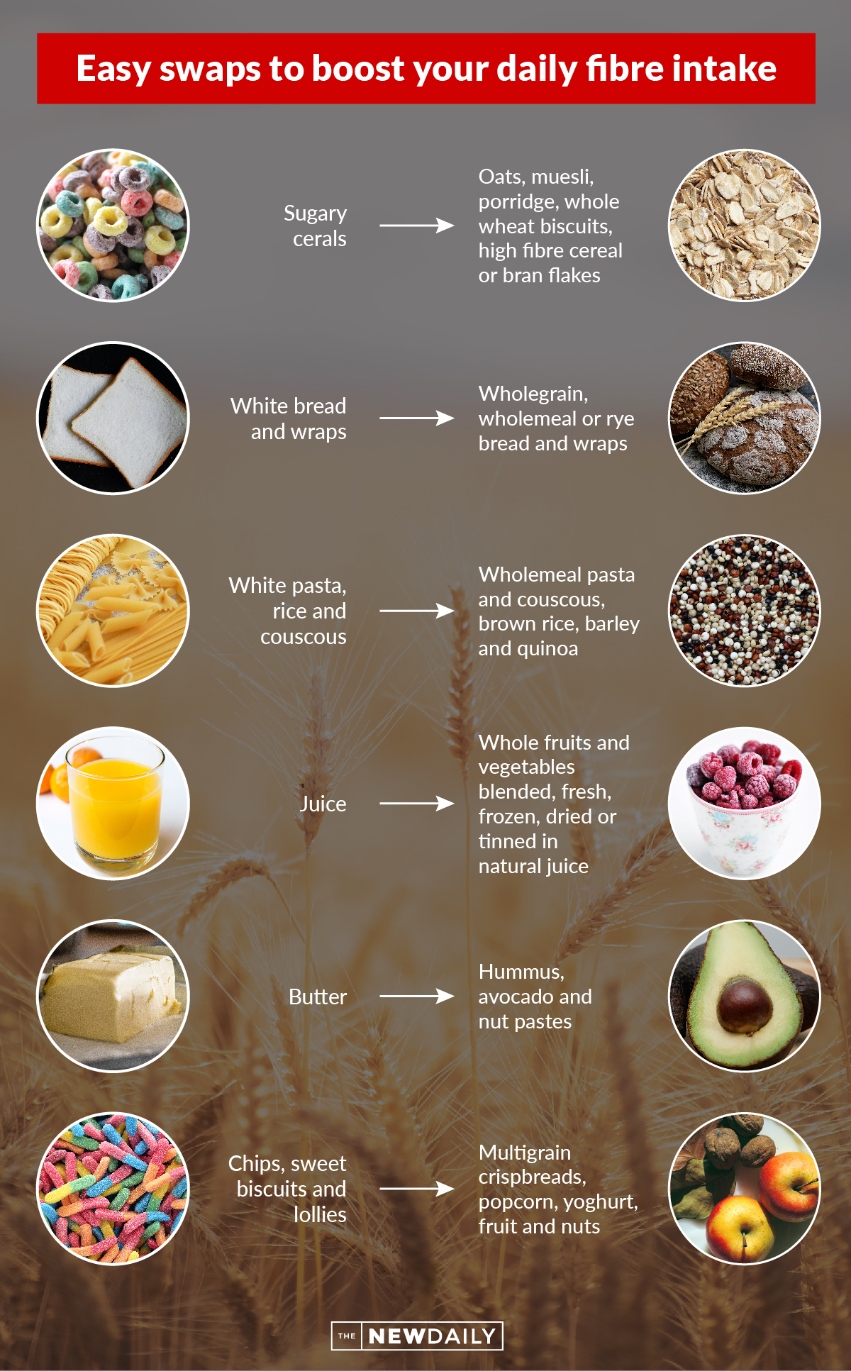 The federal health department advises that Australian women are recommended to eat 25 grams of dietary fibre per day and men 30 grams per day.