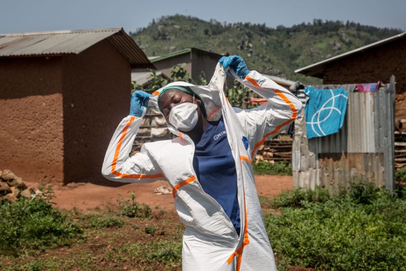 WHO worker Belinda Landu, 28, changes her protective outfit after decontaminating the house of a pastor who has just tested positive for Ebola in Beni. Photo: Getty