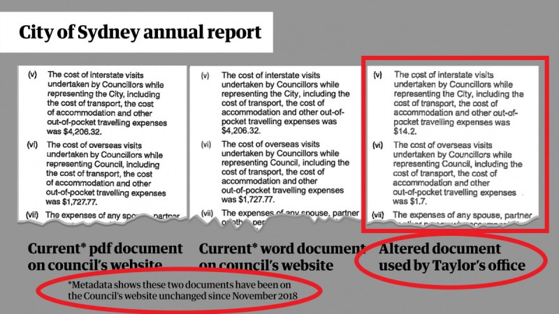 - October 24: Mr Taylor tells parliament of the September 6 report and stands by the claim the figures were obtained from the council’s website. City of Sydney publishes metadata, which proves its annual report documents have been available online, unchanged since November 2018. The City provides the information to The Guardian, which says it verified the metadata and timeline.