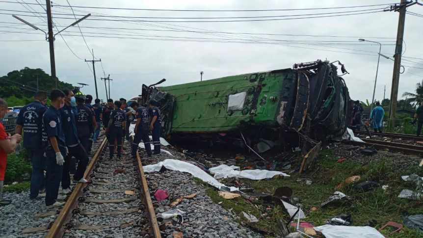 At least 20 killed and 30 injured in a bus-train collision in Chachoengsao