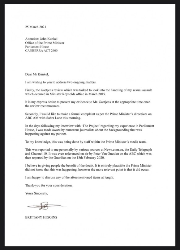 In her letter, Ms Higgins claims “multiple journalists” at News Corp and Channel 10 told her about “the backgrounding that was happening against my partner”, following her public allegations of rape by a colleague in a ministerial office.