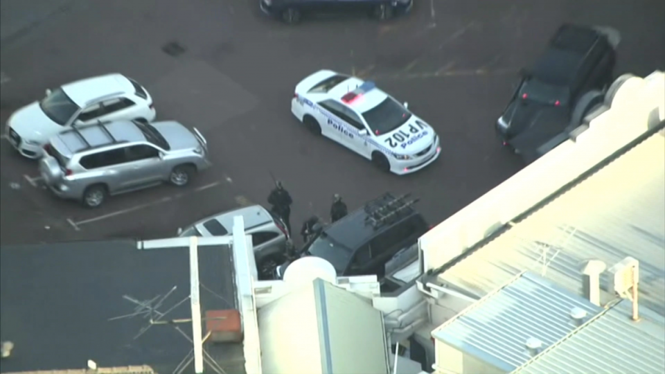 Officers used benches to barricade the front of the pharmacy, as the standoff – which began about 4.30pm WST – stretched into the evening.