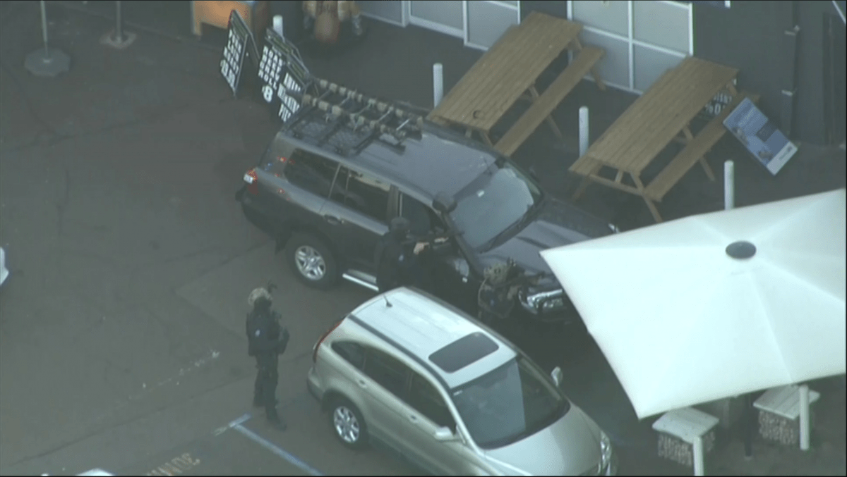 Helicopter vision from the scene shows tactical response officers with their guns drawn.