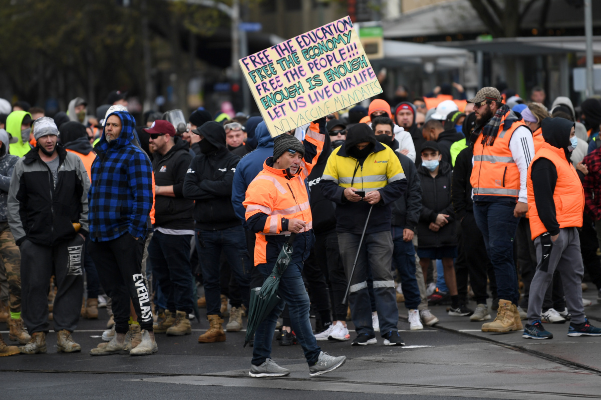 “Everyone turn up to the freedom rallies in hi-vis and work boots,” one supporter wrote in a Facebook group linked to the protests.