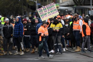 Tuesday saw a day-long protest through Melbourne’s CBD, with as many as 3000 people – mostly men, many wearing high-vis gear – massing outside CFMEU headquarters and then state parliament, before blocking traffic on the West Gate Bridge.
