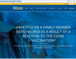 On the website, Senator Rennick claims vaccine injuries are “being covered up”.