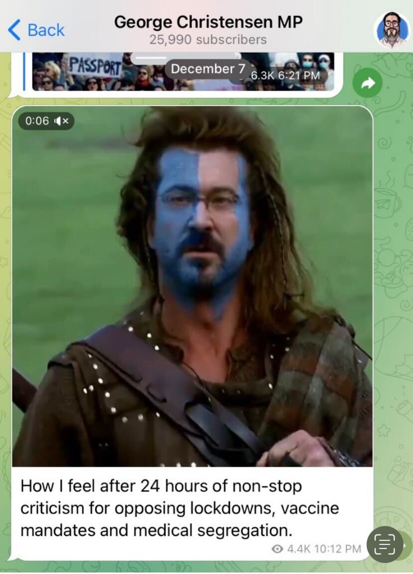 Then, about 10pm on Tuesday, Mr Christensen posted a video to Telegram of what appeared to be his face superimposed over Gibson’s, in the famous battle scene of Braveheart. In it, Gibson’s character, William Wallace, rides a horse in front of Scottish troops while saying “they’ll never take our freedom”.