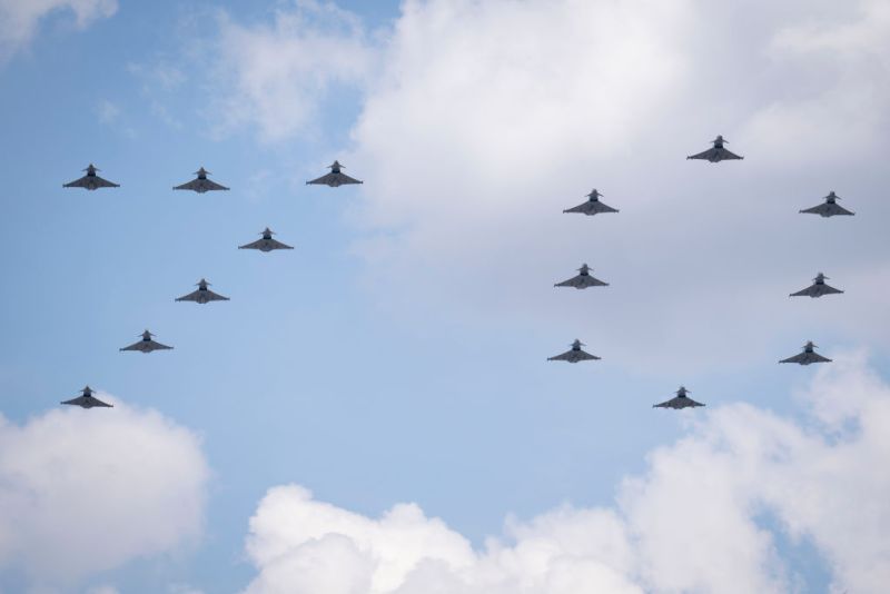 Later the crowds moved to the Mall, the grand boulevard running up to Buckingham Palace. In brilliant sunshine, they cheered and waved Union flags while modern and historic planes flew overhead.
