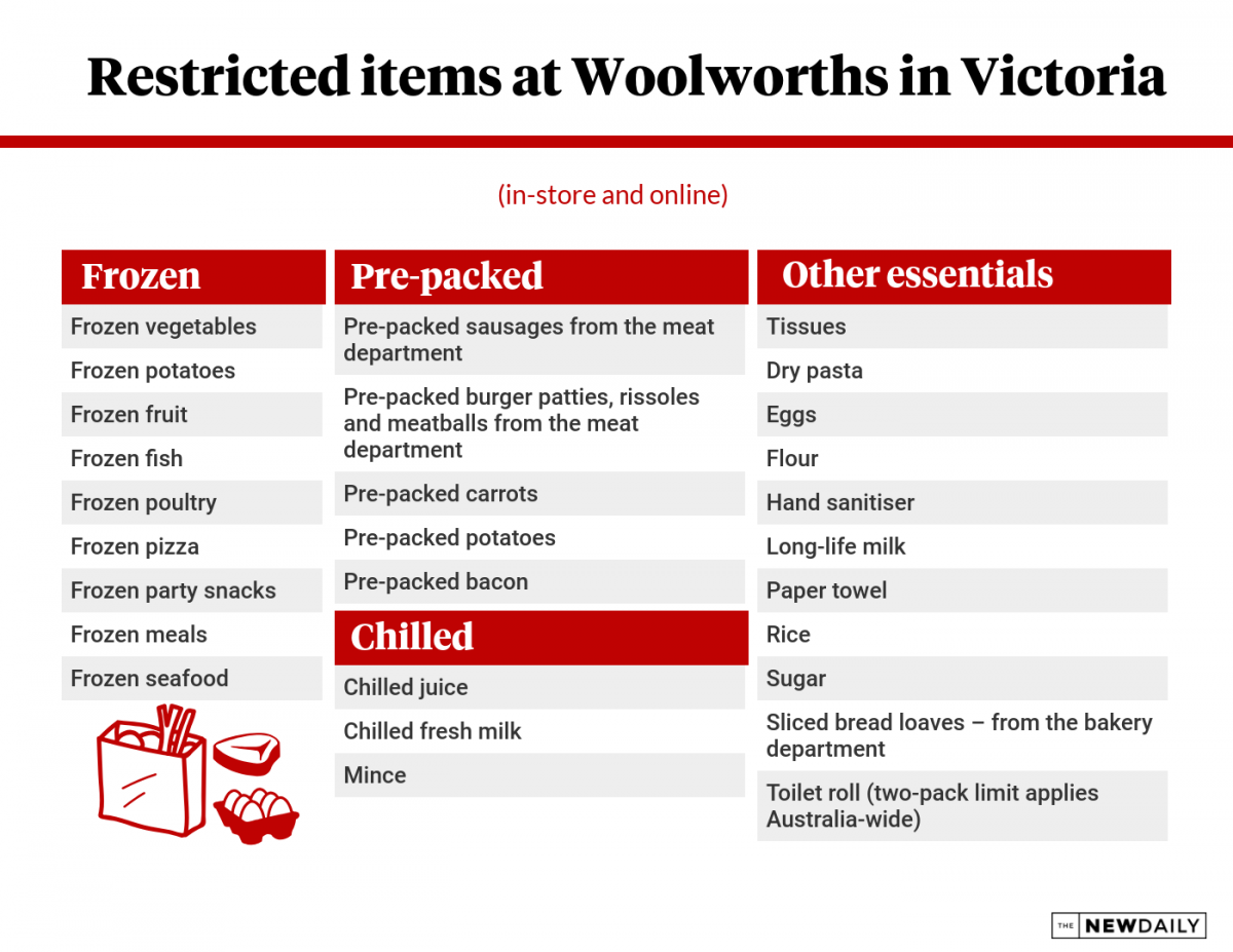 Woolworths brought in 27 purchase limits on Wednesday for all its Victorian stores, and Coles instated 20 for stores within lockdown regions only.