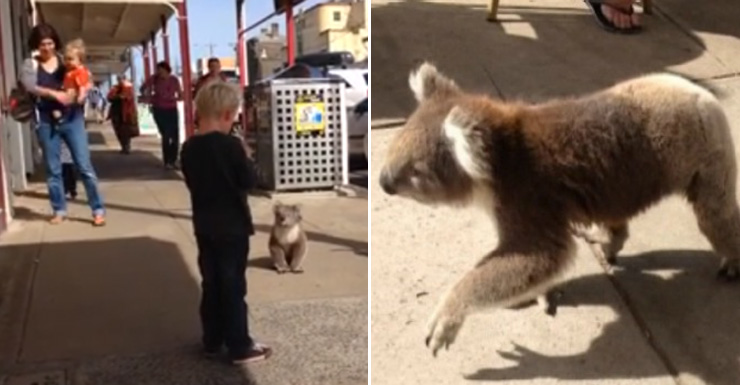 On Monday, the koala strolled down the main street of coastal town Portland, stopping in front of popular cafe The Lido Larder to have his photo taken by a delighted young boy.