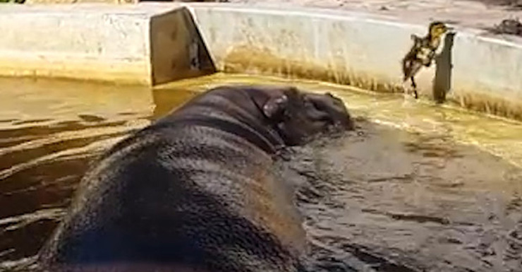 Given that hippos can weigh up to 4500kg, the little duckling was no doubt terrified that it was about to become lunch. Nonetheless, it played it very cool and trotted off after finding freedom.