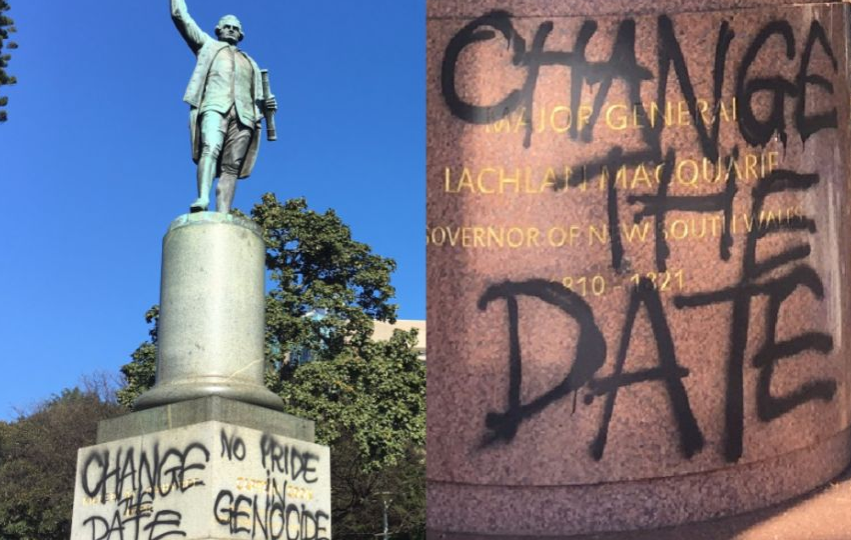 The statue’s neck and hands were painted red and an Aboriginal flag was painted over the inscription at the base.
