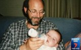 With a smile on his face, Greg Anderson holds his baby son Luke in his arms and feeds him a bottle.