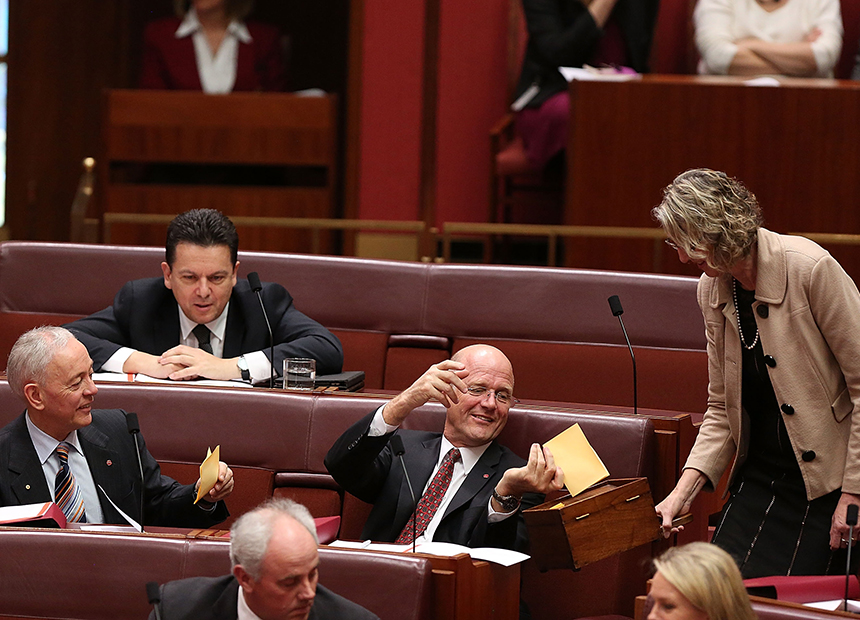 The coalition is banking on the votes of the three PUP senators, Victoria’s Ricky Muir, Family First’s Bob Day and Liberal Democrat David Leyonhjelm to pass the amended laws.