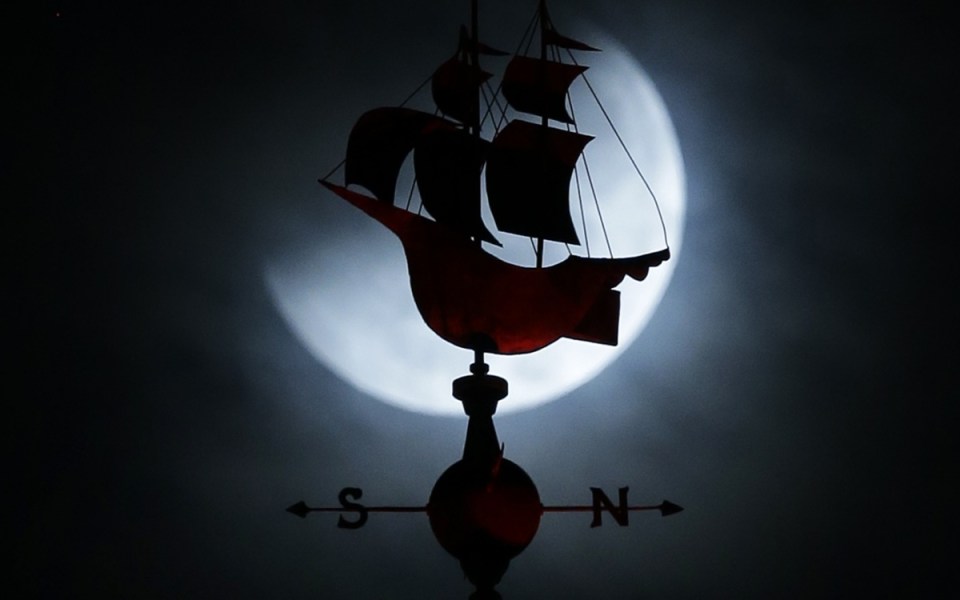 The Earth's shadow begins to fall on the moon during a total lunar eclipse, as it goes behind a weathervane shaped like a Spanish galleon on the Freedom Tower building, Wednesday, Oct. 8, 2014 in Miami.