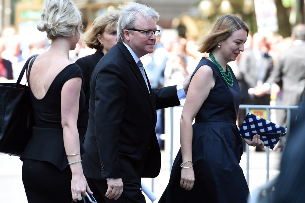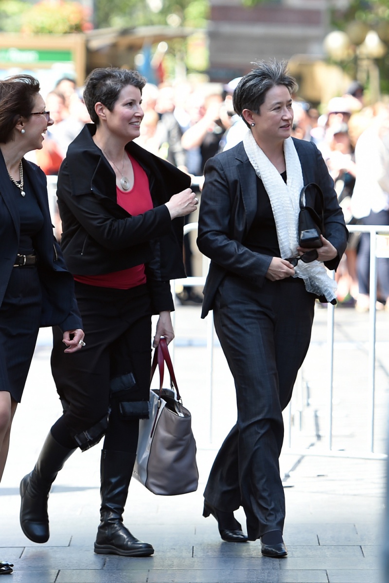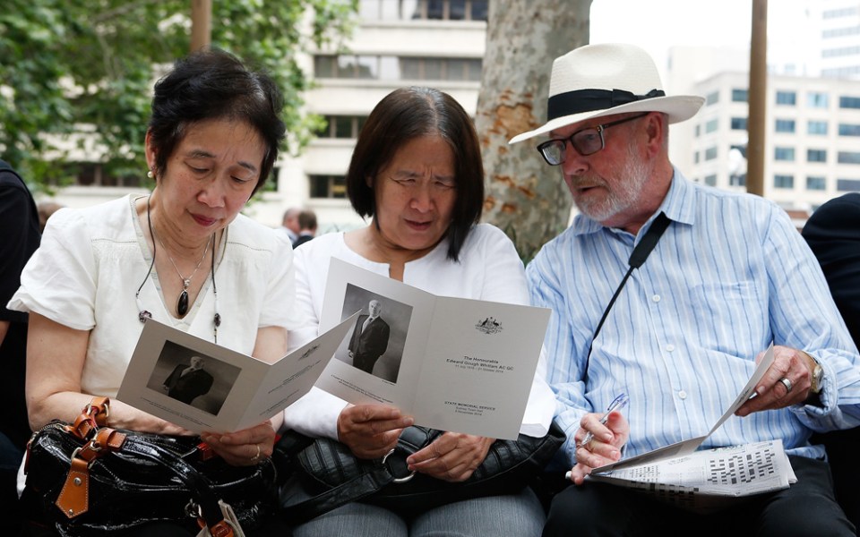News National Gough Whitlam memorial service in pictures 11:58am, Nov 5, 2014 Updated: 1:29pm, Nov 5 Gough Whitlam memorial service in pictures Ebony Bowden Journalist @ebonybowden Share Twitter Facebook Reddit Pinterest Email An indigenous woman in the crowd outside the memorial service. Former Labor Prime Minister Bob Hawke arrives to large cheers. Former Labor prime minister Kevin Rudd arrived to loud cheers with daughter Jessica. Julia Gillard speaking with former prime minister Malcolm Fraser inside the memorial. Labor Senator Penny Wong arrives with partner Sophie Allouache. Mourners gather outside the Sydney Town Hall service. Support for Tony Abbott is on the rise as Bill Shorten's approval rating drops. Greens leader Christine Milne arrives at the service. A mourner cries at the memorial service. The official program of the Gough Whitlam memorial service. Actress Cate Blanchett arriving at the service. Thousands descended on the Sydney Town Hall to pay their respects. Labor leader Bill Shorten with wife Chloe Bryce. Flowers at the memorial with the note "Thank-you comrade xxx" Papua New Guinea Prime Minister Peter O'Neill. Bill Shorten with Governor General Peter Cosgrove and wife Chloe Bryce. Mourners outside the service for Whitlam. Crowds outside the Gough Whitlam state memorial service. Former prime ministers John Howard and Bob Hawke speaking at the memorial.