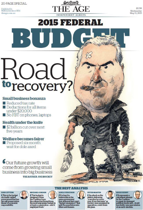 The Age‘s budget coverage featured a solo Joe Hockey as “Mild Max” on a “road to recovery”, a play on Mel Gibson’s iconic “Mad Max” character.