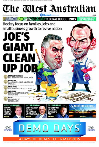 Finally, The West Australian pitched Hockey and Abbott as cleaners, fixing up the mess left by last year’s budget and working to “revive the nation”.