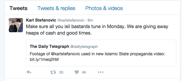 Stefanovic responded to his included in the video on Thursday, encouraging “all you ISIL bastards” to tune into the Today show for freebies and fun.