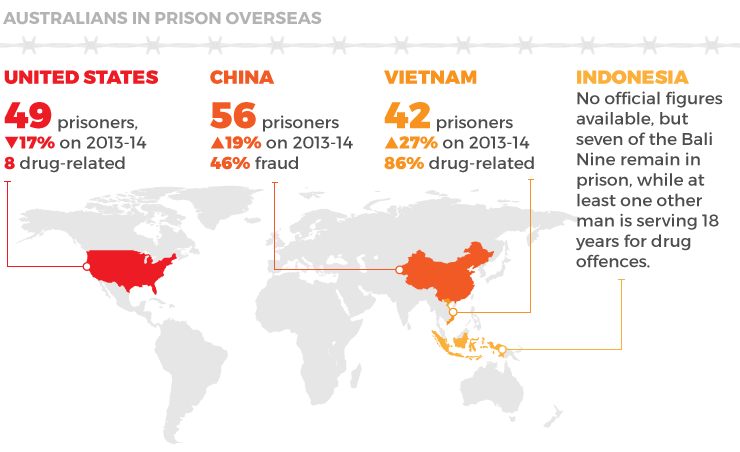 The Department of Foreign Affairs and Trade (DFAT) dealt with 371 cases of Australians in prisons across the world in 2014-15. Topping the list was China, followed by the United States and Vietnam.