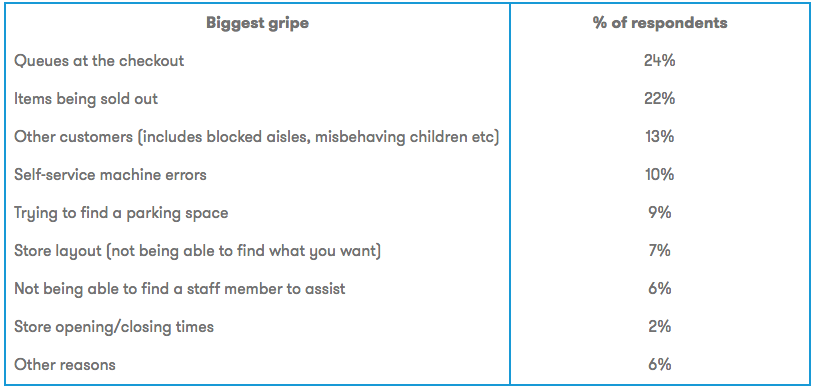 When it comes to what ticks us off, 24 per cent of respondents complained of long checkout queues, edging out items being sold out on 22 per cent.