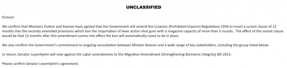 In response, Senator Leyonhjelm released the 2015 emails sent between his staff and the offices of Immigration Minister Peter Dutton and Justice Minister Michael Keenan showing the Coalition pair had agreed to lift the ban on the Adler 110 lever-action shotgun in exchange for his vote against a Labor proposal to amend the Migration Act.