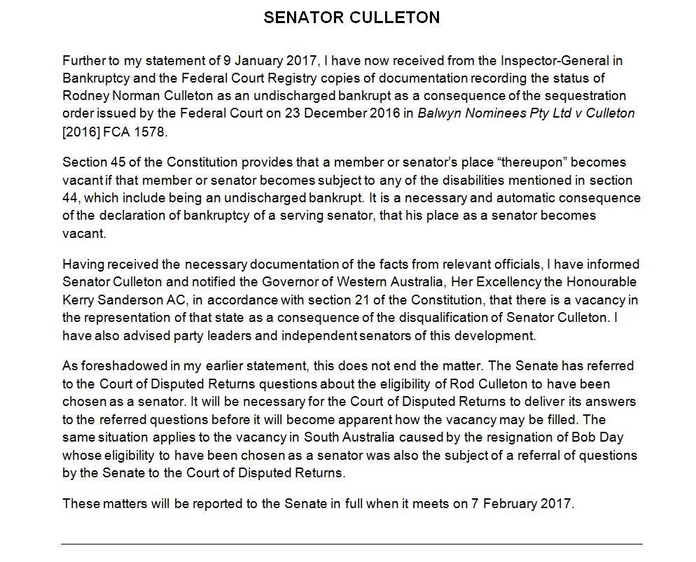 In a statement issued on Wednesday, Mr Parry said his decision to declare Mr Culleton’s seat vacant was an “automatic consequence of the declaration of bankruptcy of a serving senator”.