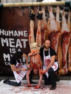 “This isn’t PETA’s style, but considering that billions of gentle sheep, chickens, cows, and pigs are strung up – one in front of the next – beaten, and sometimes skinned alive and that their throats are slit for a fleeting taste of flesh, who can blame anyone who peacefully (if enthusiastically) causes people to consider the cruelty of it all?” Ms Weyman-Jones said.