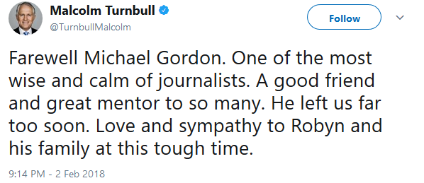 Prime Minister Malcolm Turnbull said Gordon was “one of the most wise and calm” journalists and offered love and sympathy to his wife Robyn and family.