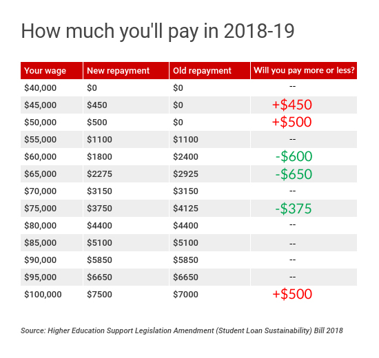 From July 1, graduates earning $45,000 will have to forfeit $450 a year in debt repayments, when before they paid nothing. And for graduates earning $55,000 – roughly the median wage in Australia – their yearly repayments will be $1375.