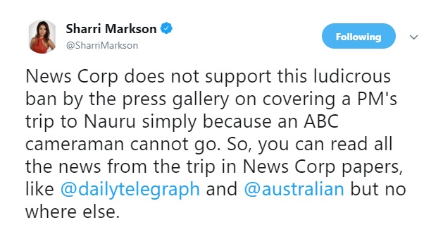 When the government of Nauru pointedly rejected an ABC camera operator from the gallery’s nominated three-person team, also including an Australian Associated Press reporter and photographer, to provide shared media coverage of the forum, the gallery president David Crowe issued a statement asking for Nauru’s pre-conditions to be reversed.