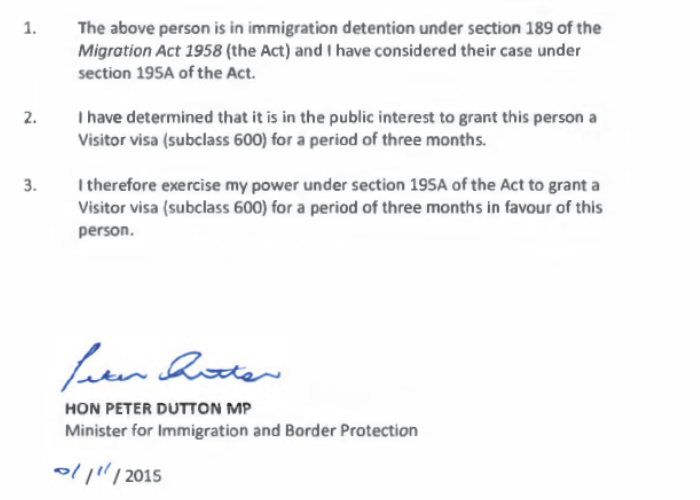 The ABC published the ministerial order signed by Mr Dutton granting the visa to the French woman, who was 27 at the time. Mr Dutton asserts in the document that granting the visa was “in the public interest”.