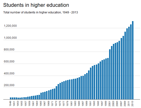 In 1995, for instance, the number of students pursuing high education stood was about 600,000. Today it is double that and growing fast.