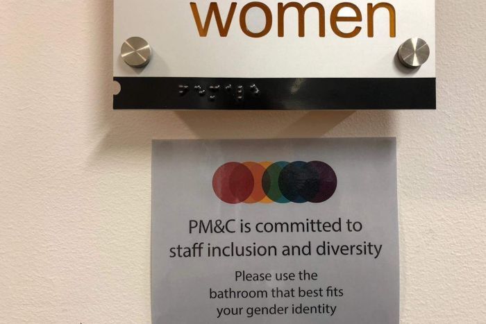 The politically correct instruction was fixed to the wall outside the women’s toilets at the Department of Prime Minister and Cabinet, less than a kilometre from Mr Morrison’s office at Parliament House.