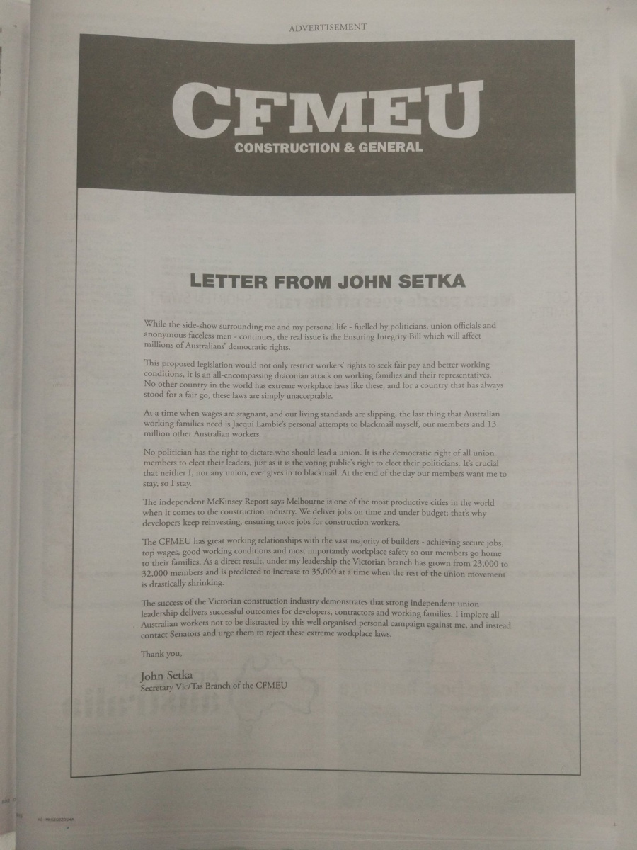In the full-page ad, written as a letter to the public, Mr Setka points to the construction union’s work improving wages and workplace safety.