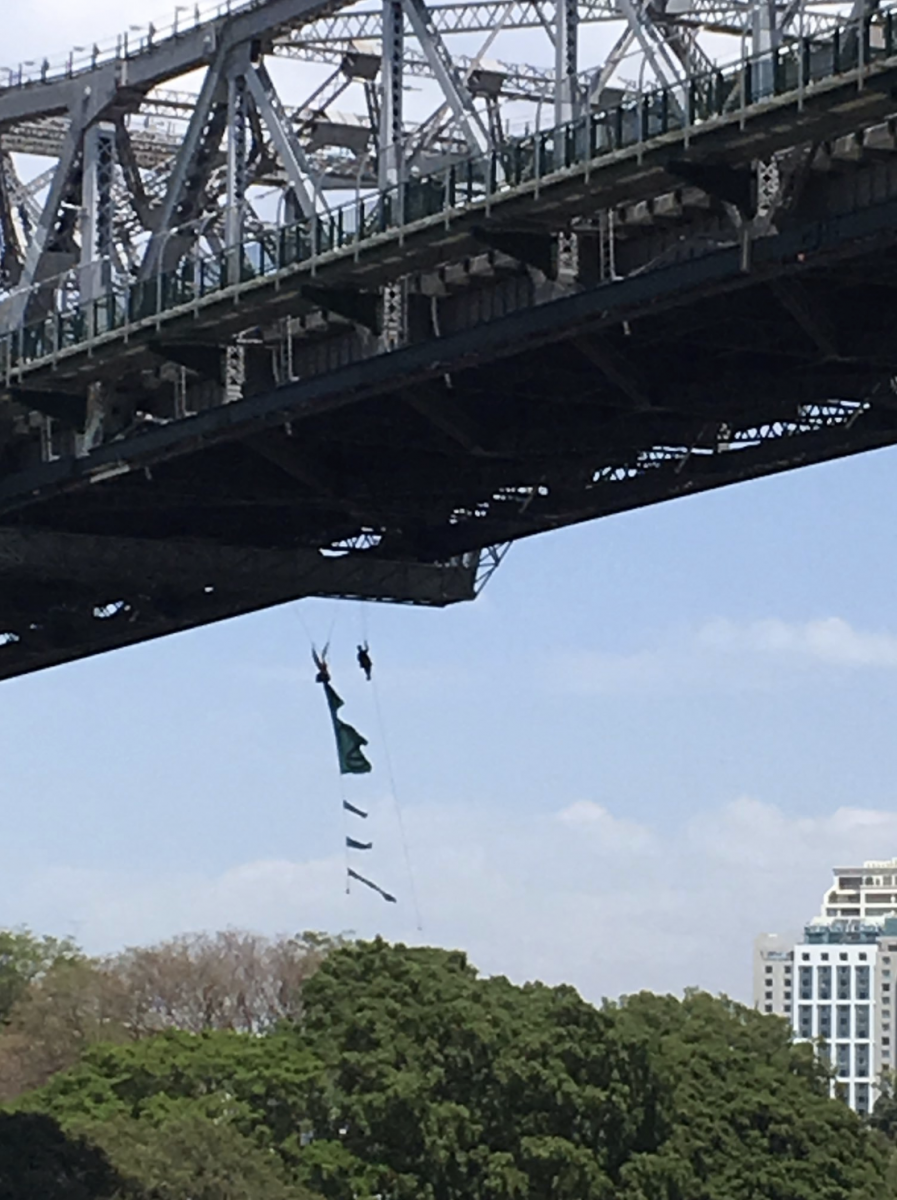 The engineer and experienced rock climber from Airlie Beach spent most of Tuesday dangling in a hammock about 10 metres underneath Brisbane’s Story Bridge, about 50 metres above the river.