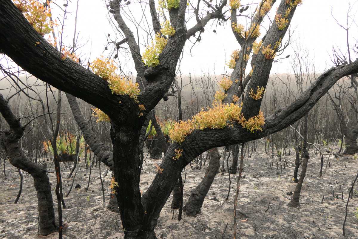 So far, regrowth has been spotted in native plants like eucalypts and banksias, known for their ability to withstand bushfires.