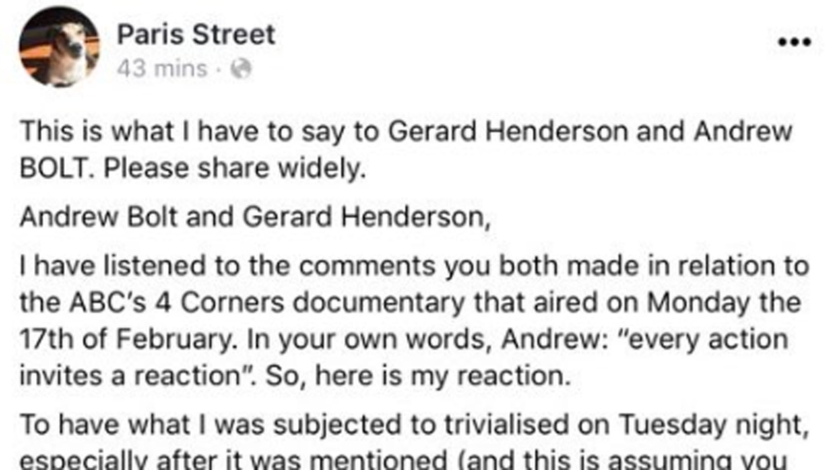 It came after the victim, Paris Street, said the comments made on Sky by Bolt and fellow conservative Gerard Henderson had “trivialised” the traumatic abuse by a St Kevin’s College teacher.