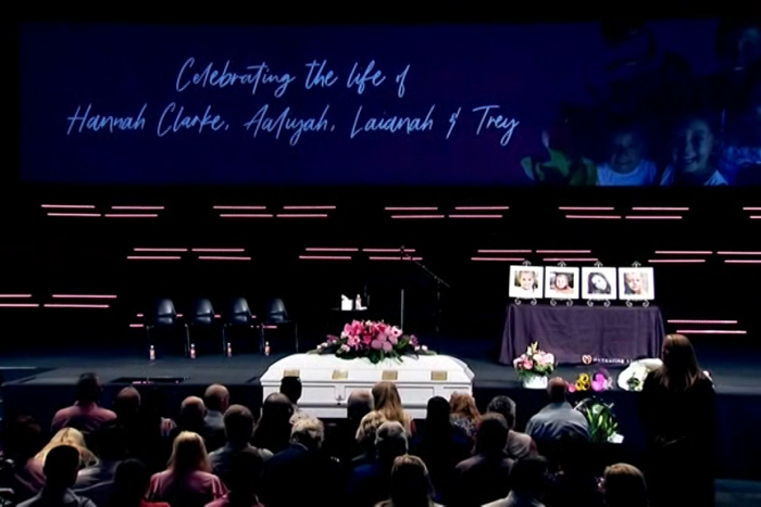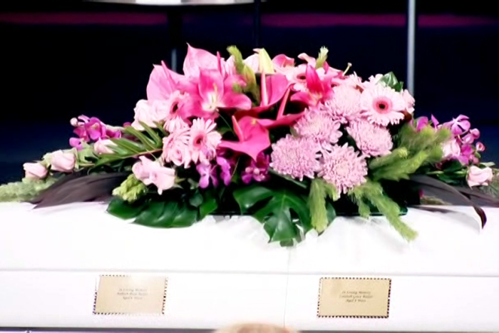 Hannah Clarke and her three children will be laid to rest in a single shared white coffin adorned with pink flowers after being farewelled in an emotional service at a Brisbane church.