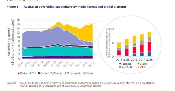 The ACCC’s digital platforms inquiry found that while total advertising expenditure in Australia has risen with population growth to $16 billion annually by 2018, radio, TV, outdoor and cinema and print ad revenues have fallen consistently since 2007.