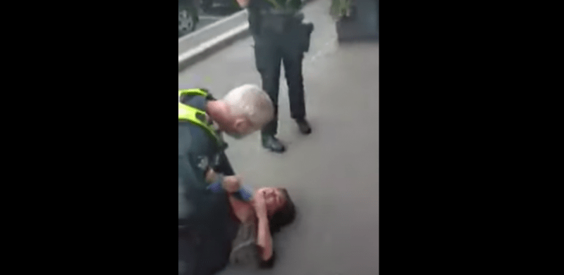 Video has emerged of a Victorian police officer arresting an unmasked young woman who claims she is being choked during the confrontation.